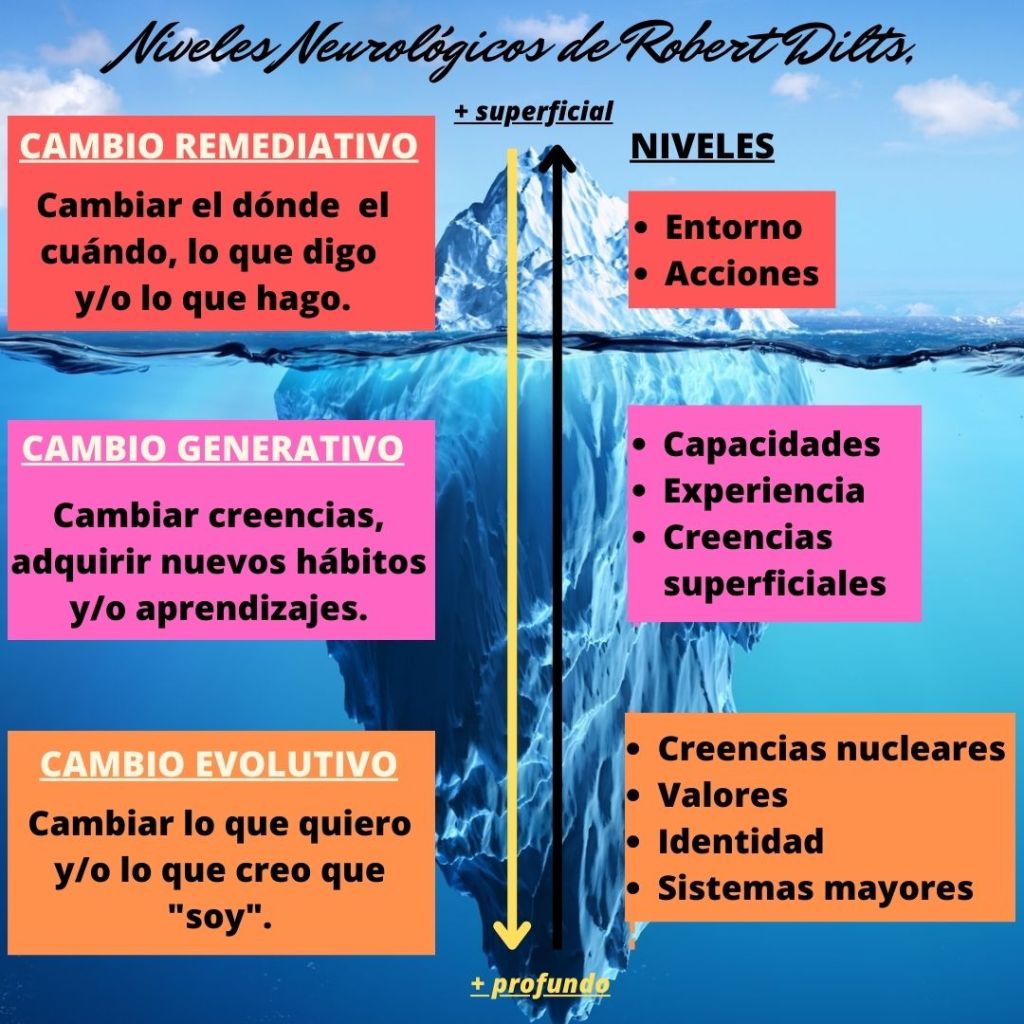En ocasiones, para cambiar la acción y conseguir el resultado que busco, voy a tener que poner foco en mi mundo interno, en actualizar experiencias, capacidades, creencias, valores e incluso mi propia identidad.